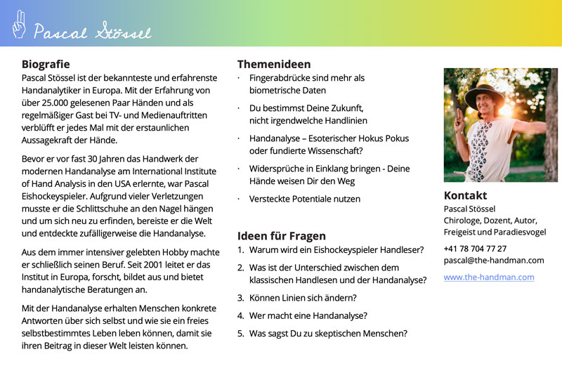 Pascal Stössel ist der bekannteste und erfahrenste Handanalytiker in Europa. Mit der Erfahrung von über 25.000 gelesenen Paar Händen und als regelmäßiger Gast bei TV- und Medienauftritten verblüfft er alle mit der erstaunlichen Aussagekraft der Hände.